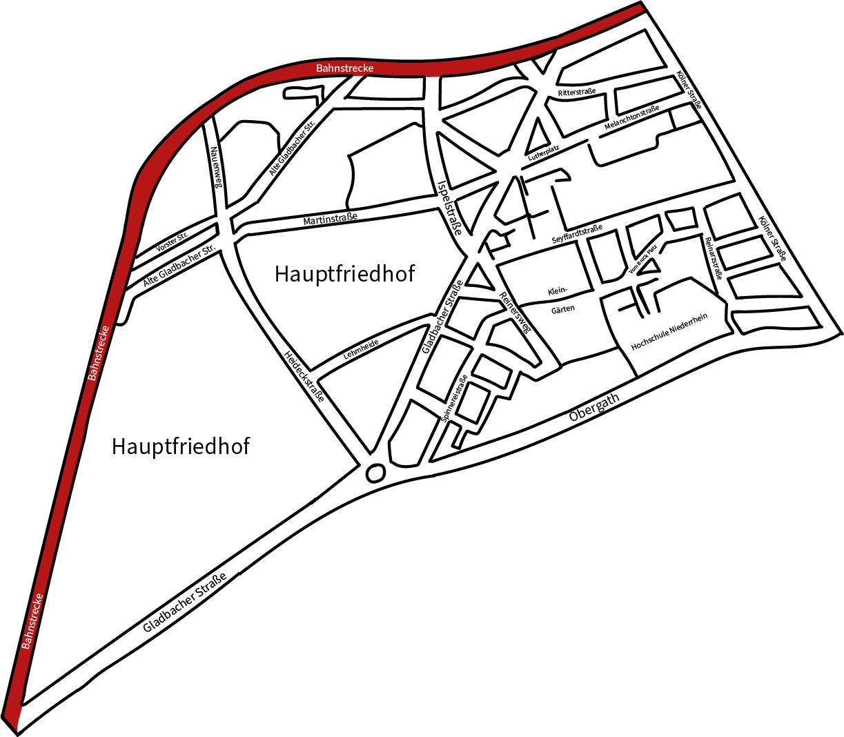 Lehmheide wird umschlossen von der Kölner Straße im Osten, einem Teil der Gladbacher Straße und der Obergath im Süden und von der Bahn-Güter-Strecke im Norden und Westen.